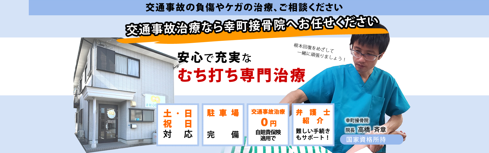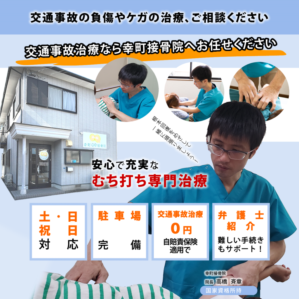 幸町接骨院は、交通事故に遭われた方の救済を1番に考えて、施術や対応に力を入れております。経験年数が10年以上の国家資格を有した施術家が対応しますので、安心しておまかせください。